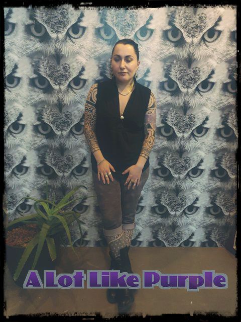 Still, since I am absolutely used to any kind of questions about my tattoos, I roll up the sleeve of my black blouse a little bit more, I show him the full purple tattoo he is referring to.